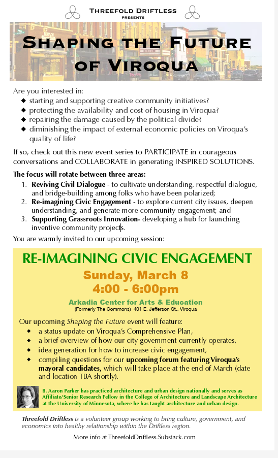 Dear friends, I am pleased to share that our next Shaping the Future of Viroqua event is coming right up on Sunday, March 8 from 4 to 6 pm at Arkadia (formerly the Commons.)